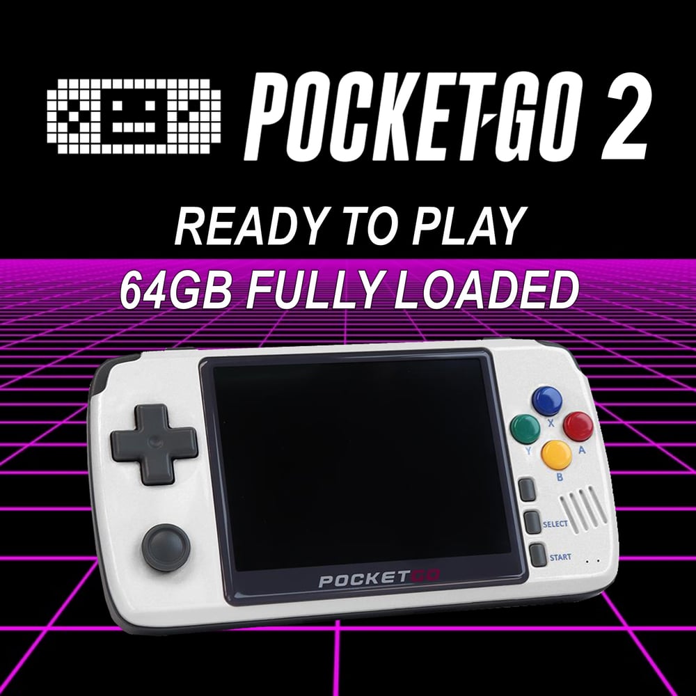 This is the latest PocketGo 2 V2 handheld console (3.5" screen) with a pre-configured 64GB micro SD card. Ready to play with all the arcade classics and popular consoles up to the early 2000's. There are too many games to list!